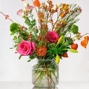 Een boeket met stralende herfstbloemen waaronder bruin-gouden chrysanten en fel oranje gerbera’s